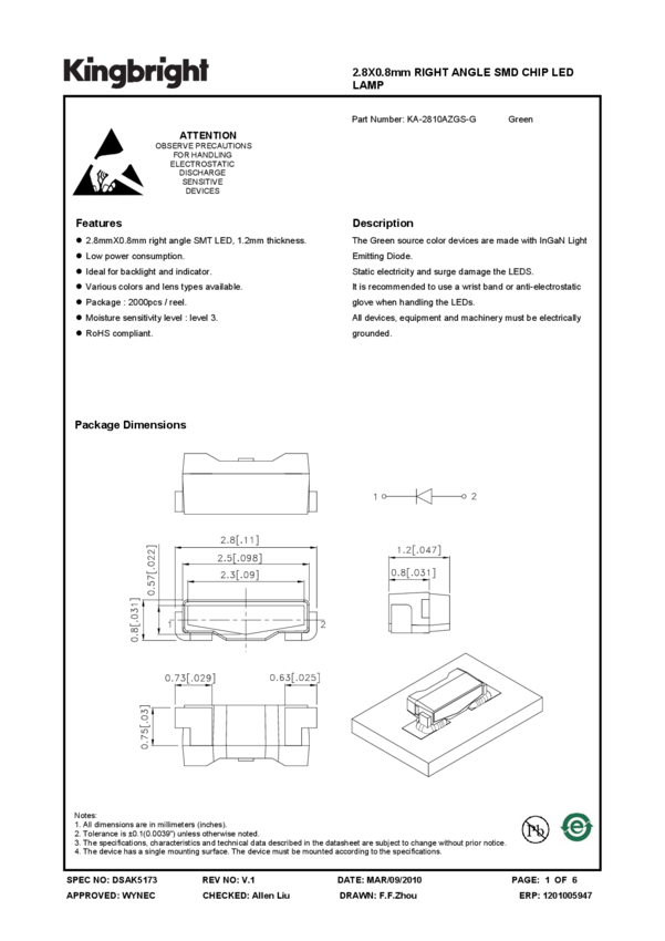 Dioda LEDRA2810-GW90, SMD kątowa, typ 2810, zielona (Pure Green) 515-525 nm, superjasna 460-700 mCd /20mA, water clear, 90 stopni, Honglitronic