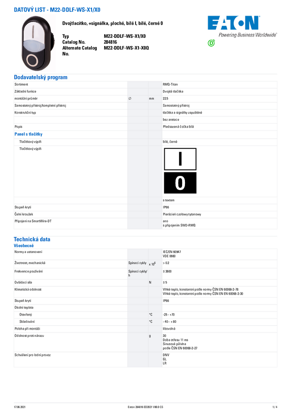 Eaton 284816 M22-DDLF-WS-X1/X0 Przycisk podwójny pierścień przedni z tworzywa sztucznego 1 szt.