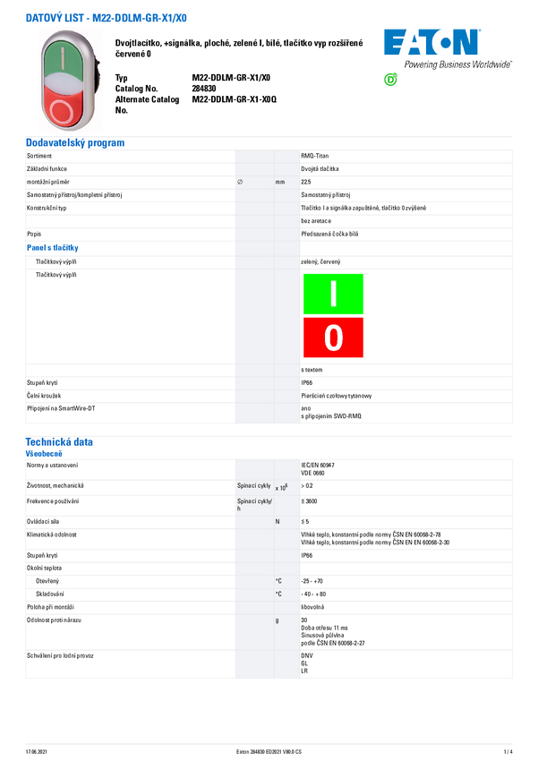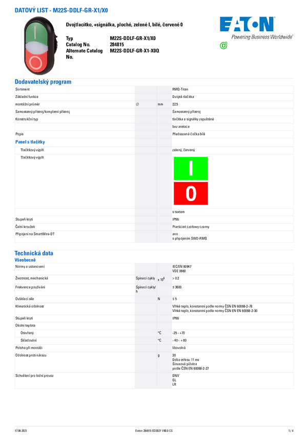 Eaton 284830 M22-DDLM-GR-X1/X0 Przycisk podwójny pierścień przedni z tworzywa sztucznego 1 szt.