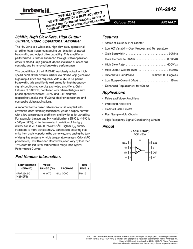80MHz, High Slew Rate, High Output Current, Video Operational Amplifier