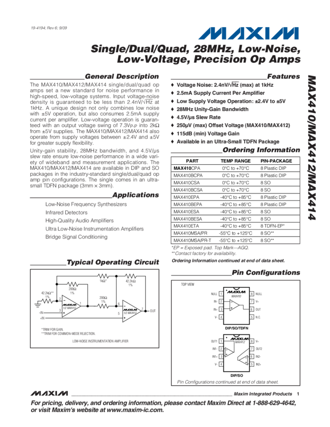 MAX412 Dual, 28MHz, Low-Noise, Low-Voltage, Precision Op Amp