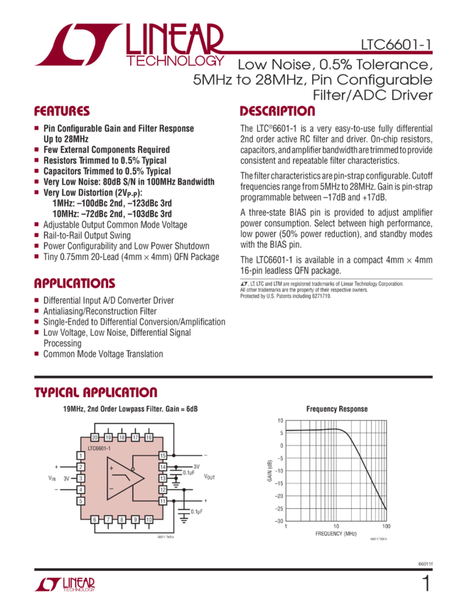 Low Noise, 0.5% Tolerance, 5MHz to 28MHz, Pin Configurable Filter/ADC Driver