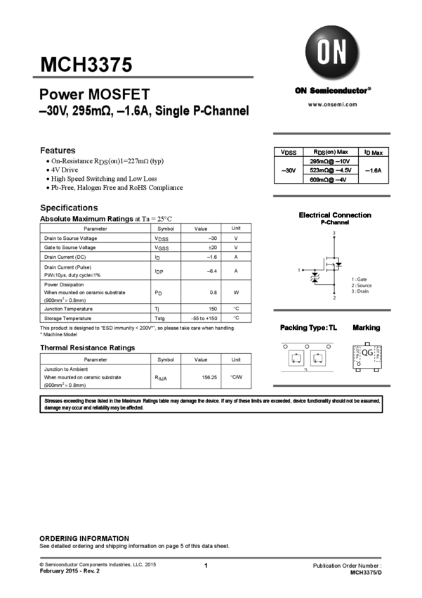 Power MOSFET, -30V, 295mΩ, -1.6A, Single P-Channel