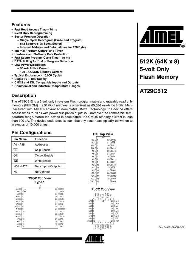 Pamięć FLASH 29C512 PLCC32 (zam. 29F512) 120ns, –40°C do +85°C