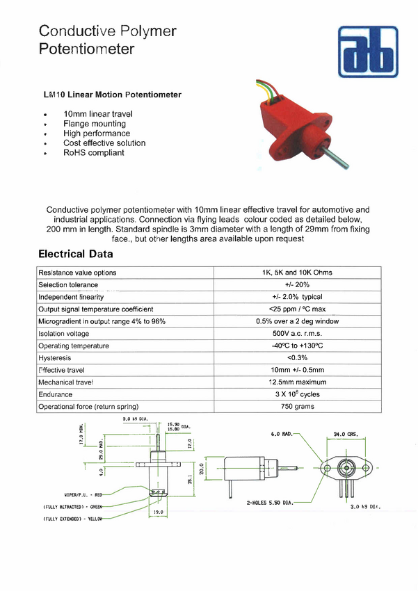 Czujnik położenia travel 10mm(pomiar); 5kohm;tol.20%;lin+-2% ośka 3mm; mech.travel 12mm; trw.3 mil.cykli; kabelki; wys 20mm; dł. 35,1+29mm; mocowanie 2 otwory rozstaw 34mm; sprężyna powrotna ( na zam. rezystancje 1k,10k)