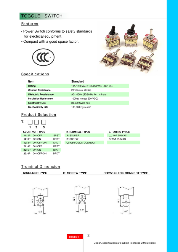 Przełącznik; dźwigniowy; T-23BS; (ON)-OFF-(ON); 2 tory; 3 pozycje; 6 pin; na panel; monostabilny; zacisk śruby; 15A; 250V AC; 29mm; Highly; RoHS