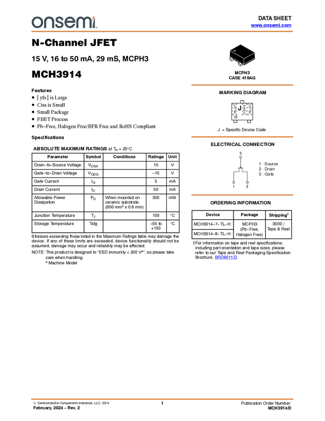 N-Channel JFET, 15V, 16 to 50mA, 29mS, MCPH3