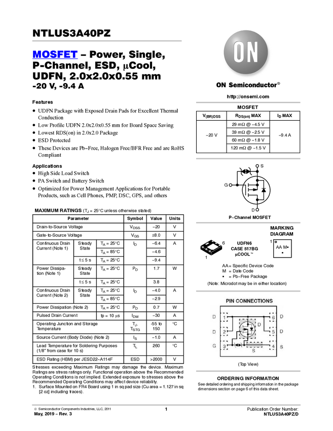 Single P-Channel µCool™ Power MOSFET with ESD Protection -20V -9.4A 29mΩ