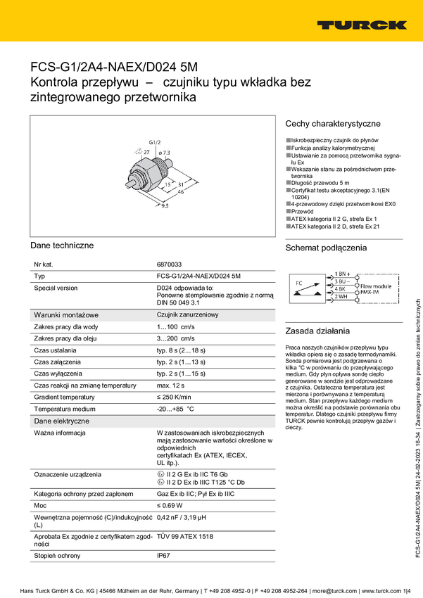 Turck 6870033 Czujnik zanurzeniowy FCS-G1/2A4-NAEX/D024 5M, 1 szt.