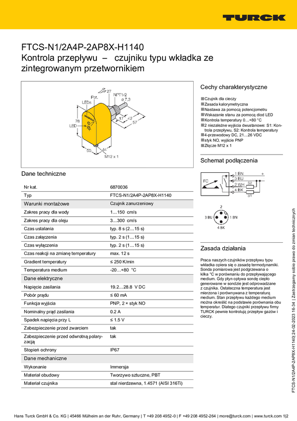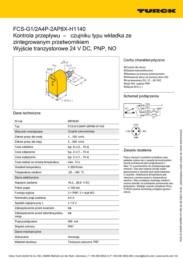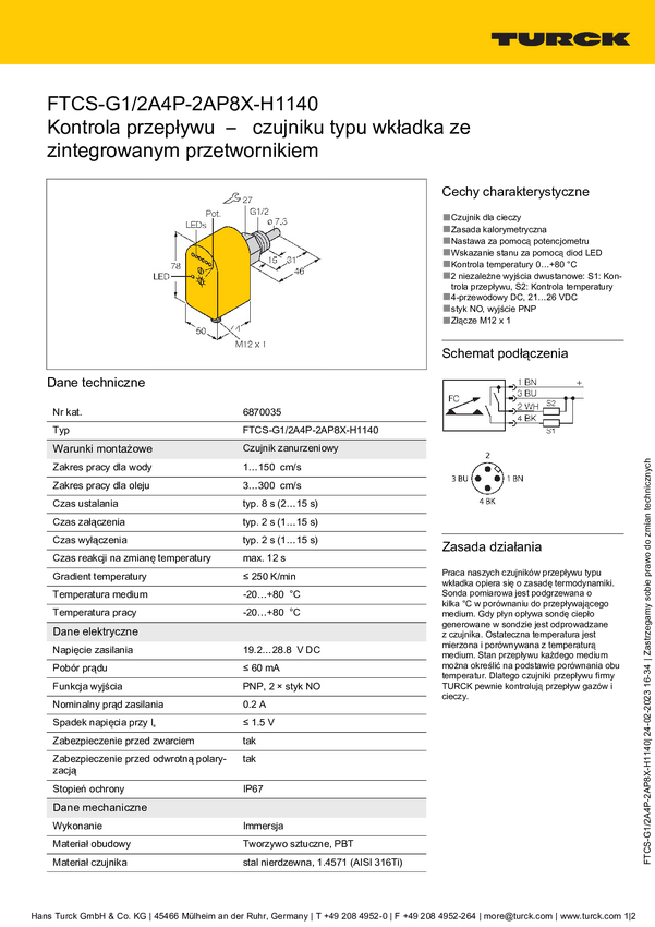 Turck 6870030 Czujnik zanurzeniowy FCS-G1/2A4P-2AP8X-H1140, 19.2 - 28.8 V/DC, 1 szt.