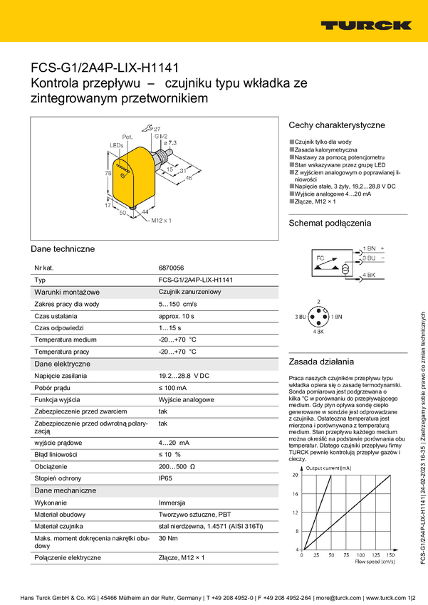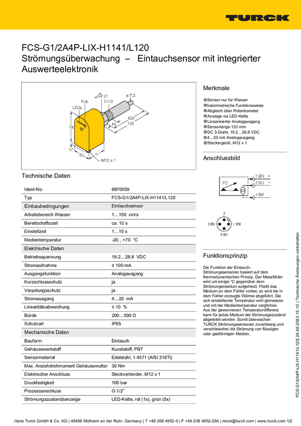 Turck 6870056 Czujnik zanurzeniowy FCS-G1/2A4P-LIX-H1141, 19.2 - 28.8 V/DC, 1 szt.