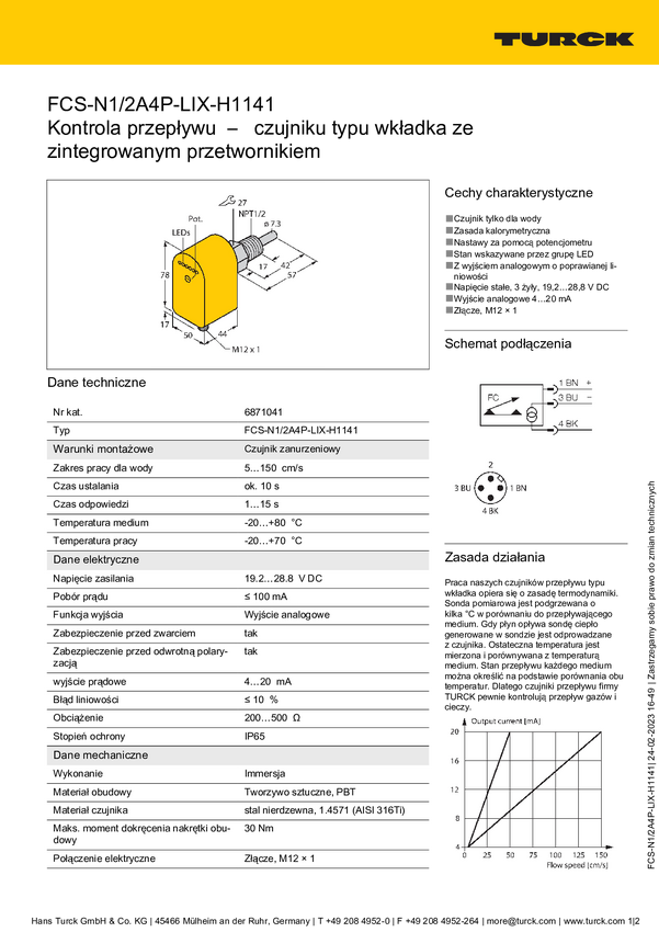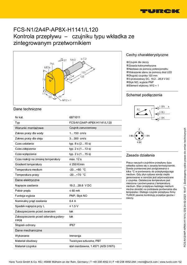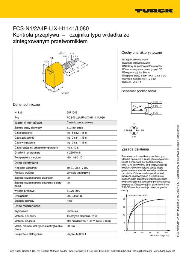 Turck 6871041 Czujnik zanurzeniowy FCS-N1/2A4P-LIX-H1141, 19.2 - 28.8 V/DC, 1 szt.