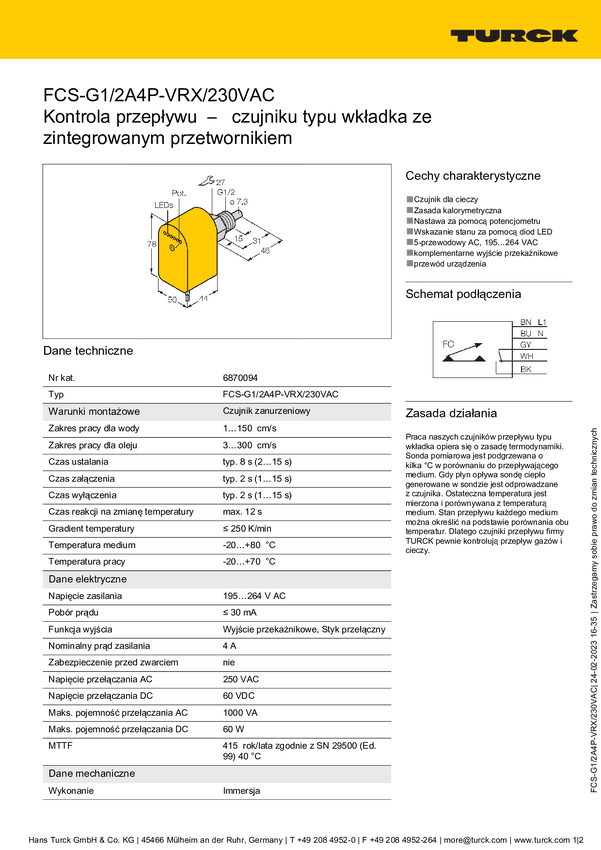 Turck 6870203 Czujnik zanurzeniowy FCS-GL1/2A4P-VRX/24VDC 5M, 19.2 - 28.8 V/DC, 1 szt.