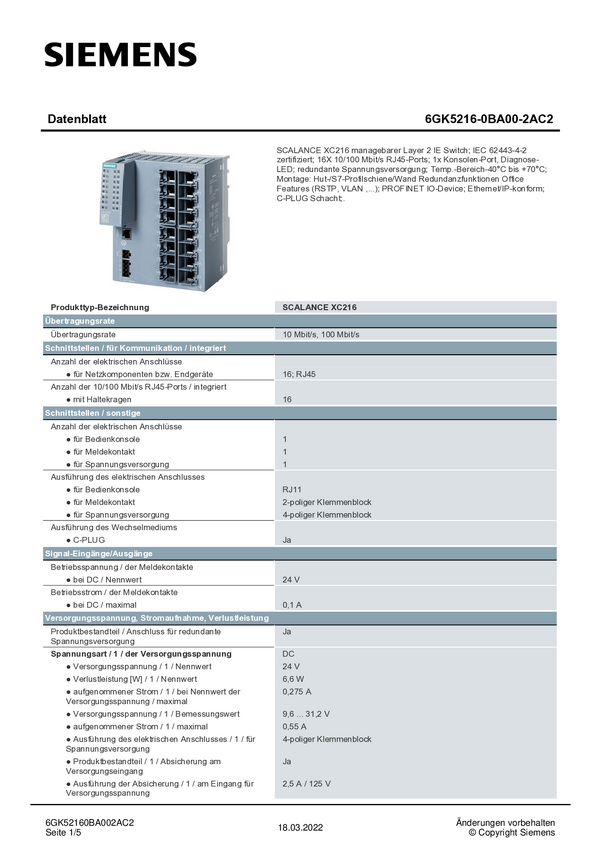 Switch przemysłowy Ethernet Siemens 6GK5216-0BA00-2AC2 6GK52160BA002AC2