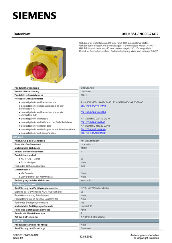 Siemens 3SU18510NC002AC2 3SU1851-0NC00-2AC2 Obudowa do montażu na ziemi, zawiera osłonę 1 przycisk czerwony odkręcenie 1