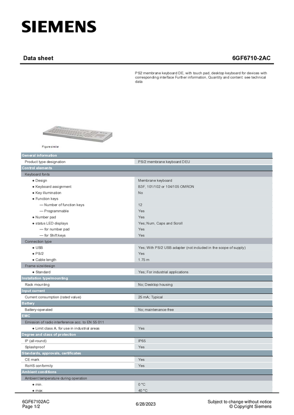 Klawiatura Siemens 6GF6710-2AC Niemiecki, QWERTZ