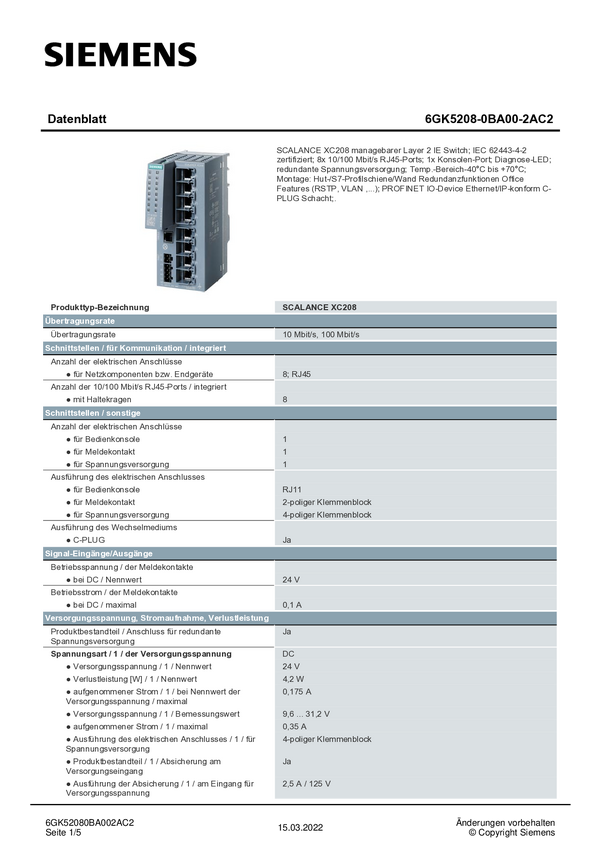 Switch sieciowy Siemens 6GK5208-0BA00-2AC2 6GK52080BA002AC2, 10 MBit/s, 100 MBit/s