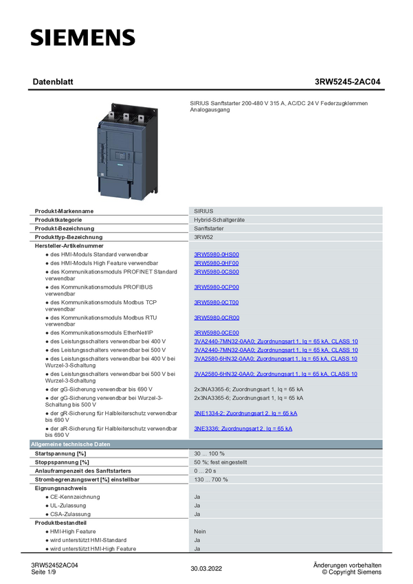 Siemens 3RW5245-2AC04 3RW52452AC04 Soft-start Moc silnika przy 400 V 160 kW Moc silnika przy 230 V 90 kW 200 V, 480 V Na