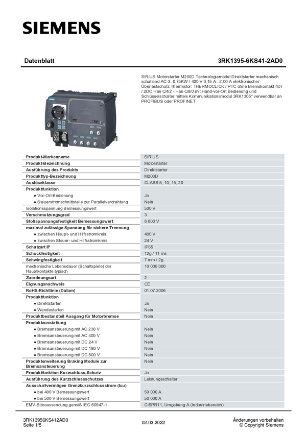 Siemens 3RK1395-6KS41-2AD0 3RK13956KS412AD0 Rozrusznik silnika Moc silnika przy 400 V 0.75 kW 400 V Natężenie znamionowe