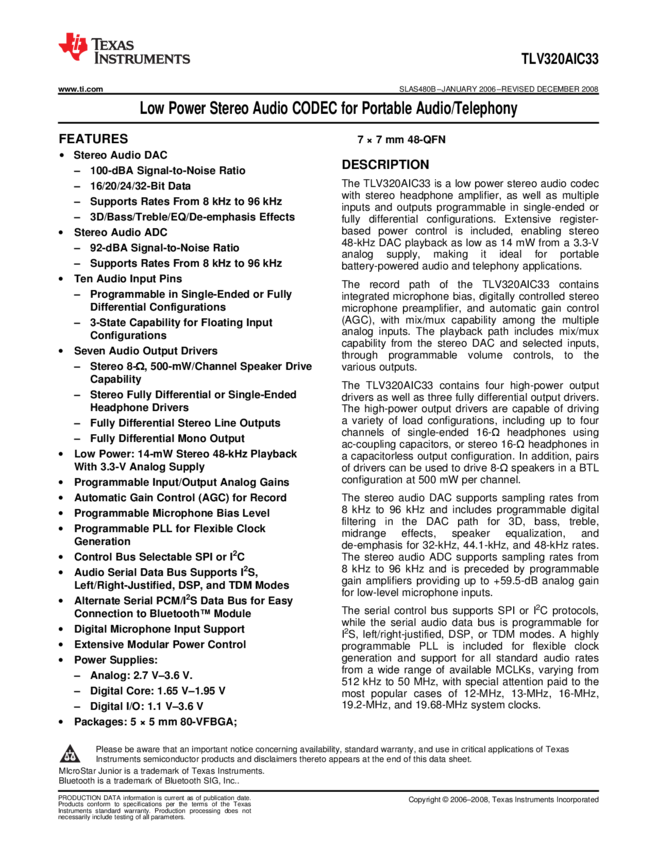 Audio Codec 2ADC / 2DAC 24-Bit 80-Pin BGA MICROSTAR JUNIOR T/R