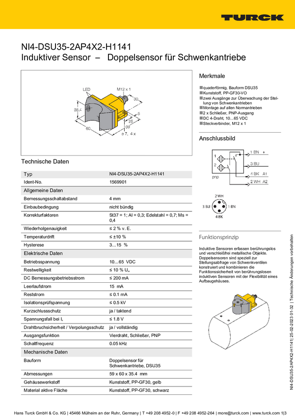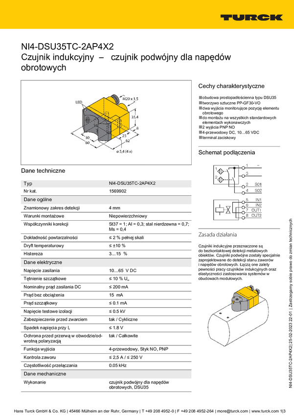 Turck Czujnik indukcyjny nie podtynkowy PNP, Zamykający NI4-DSU35TC-2AP4X2/3GD