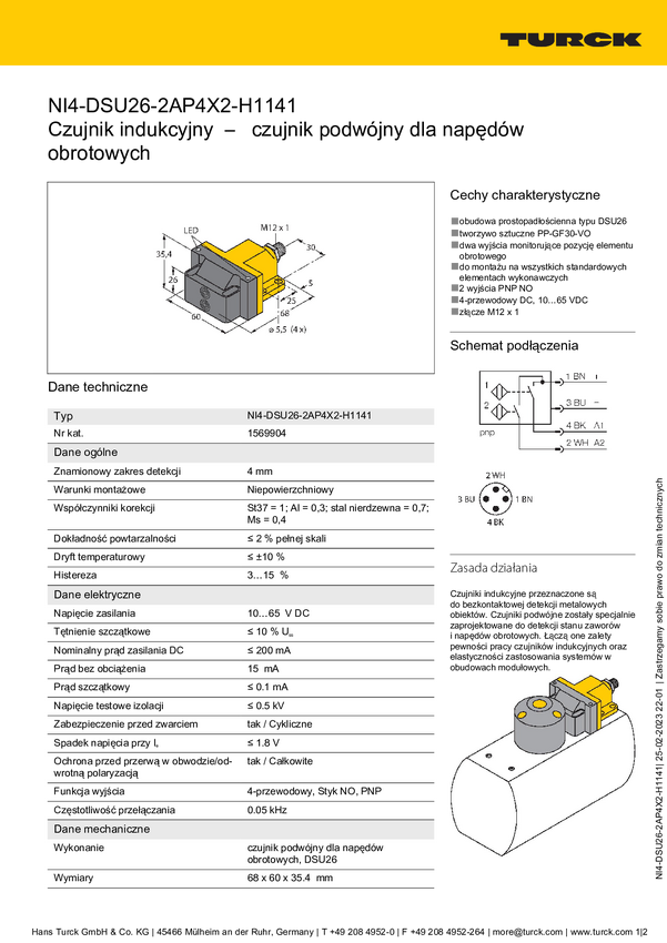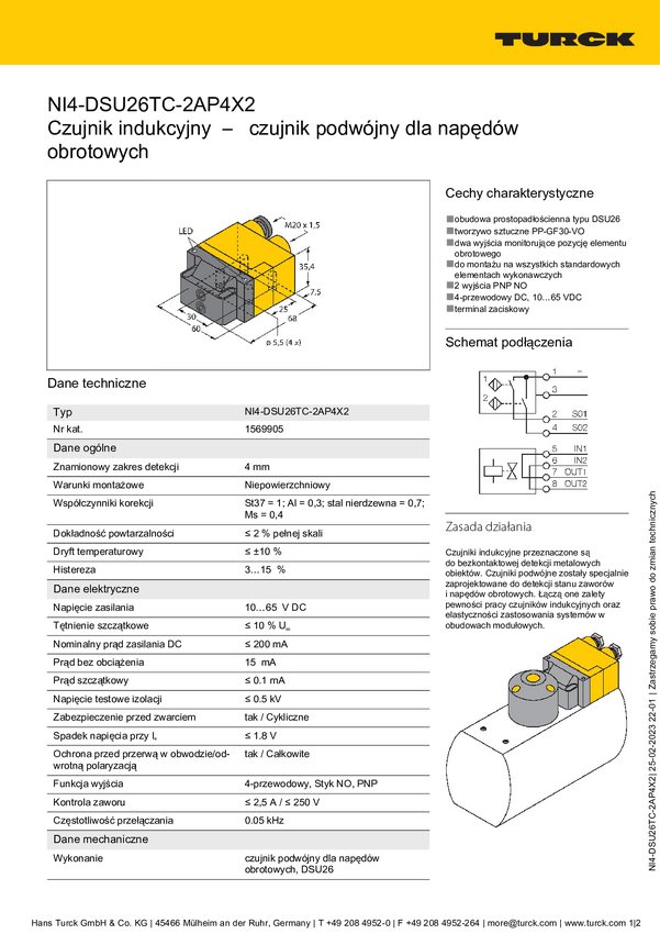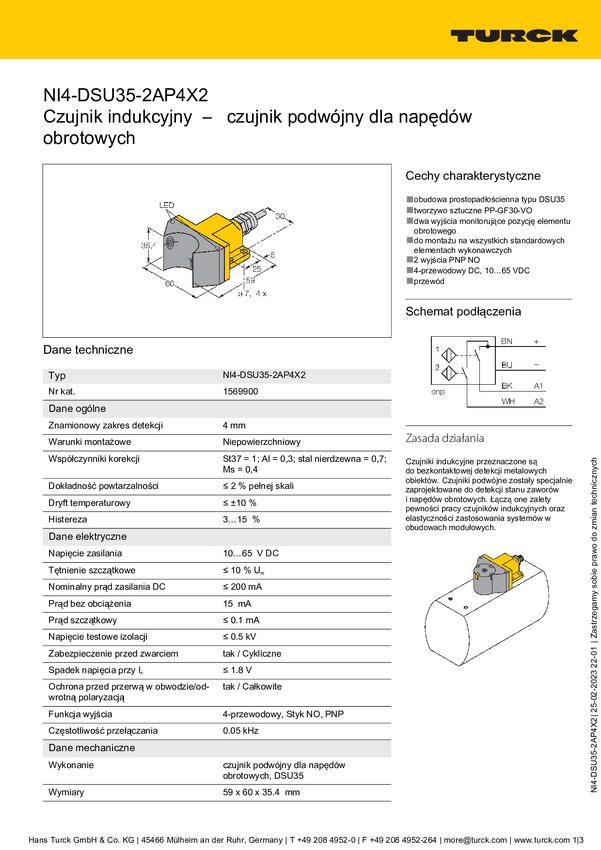Turck Czujnik indukcyjny nie podtynkowy PNP, Zamykający NI4-DSU35-2AP4X2