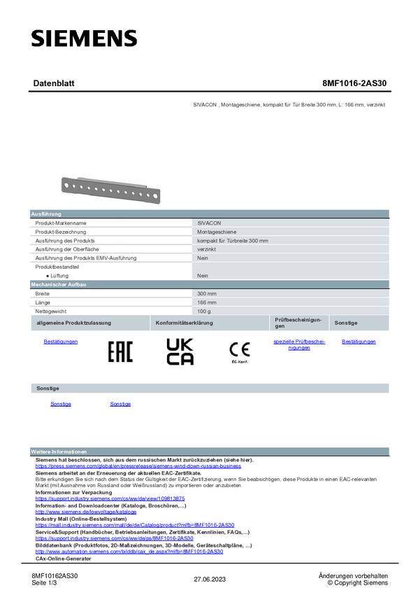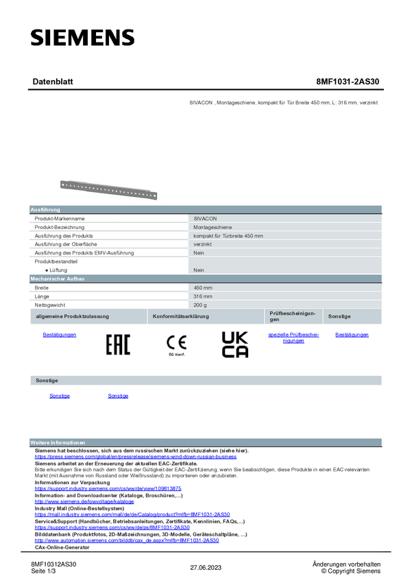 Szyna montażowa Siemens 8MF1031-2AS30 1 szt.