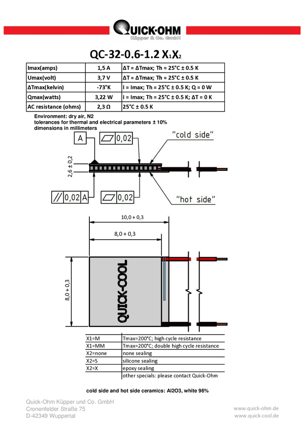 QuickCool QC-32-0.6-1.2AS Ogniwo Peltiera 3.7 V 1.5 A 3.22 W (LxBxH) 10 x 8 x 2.6