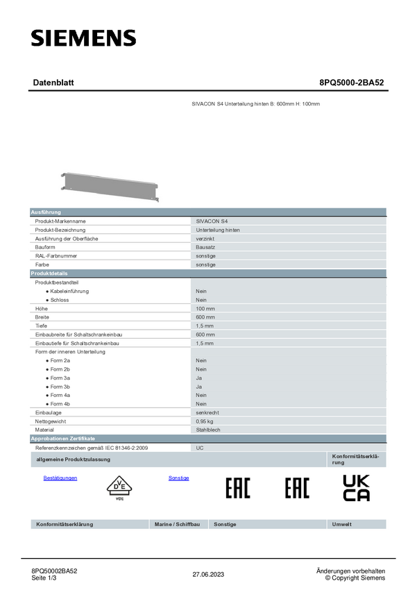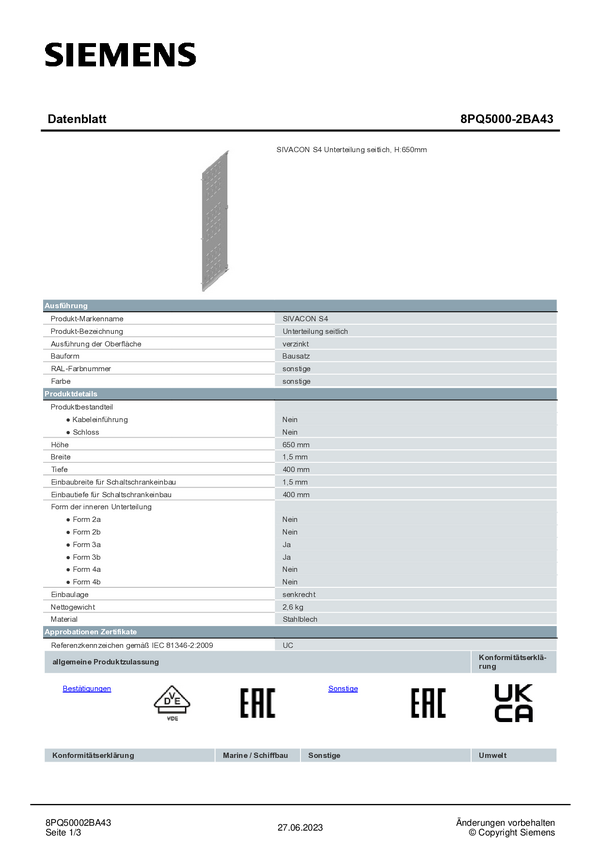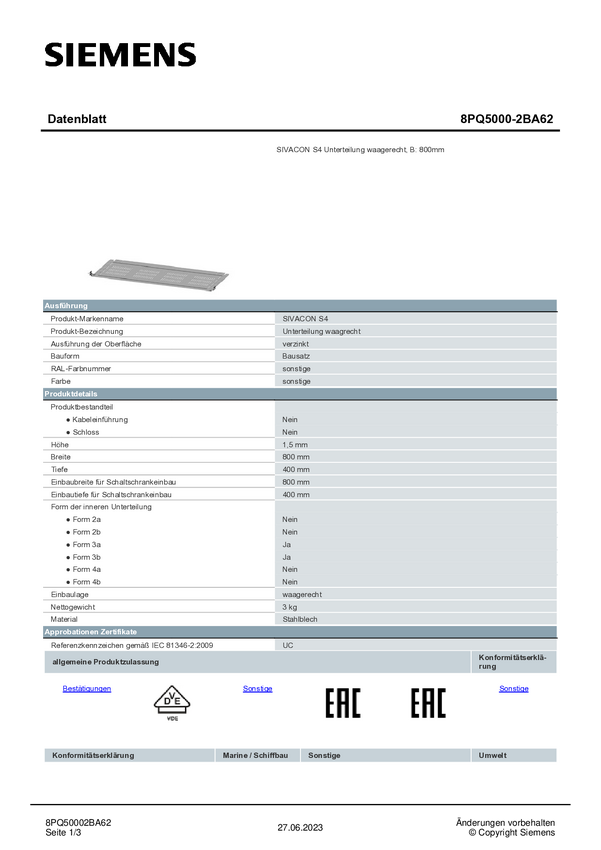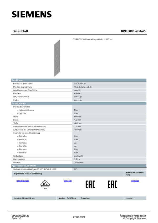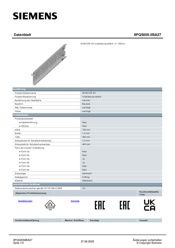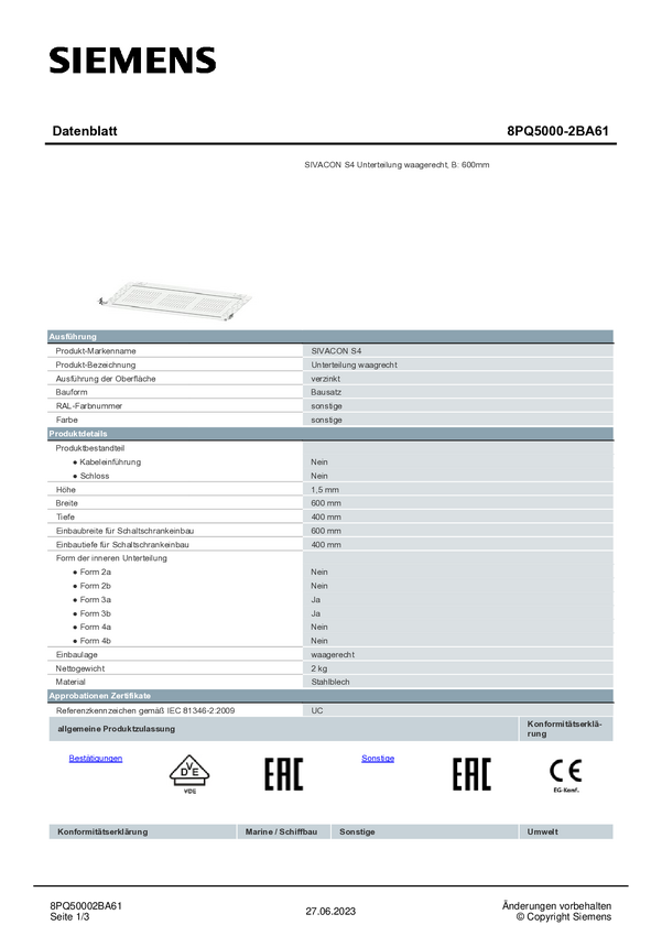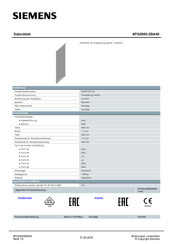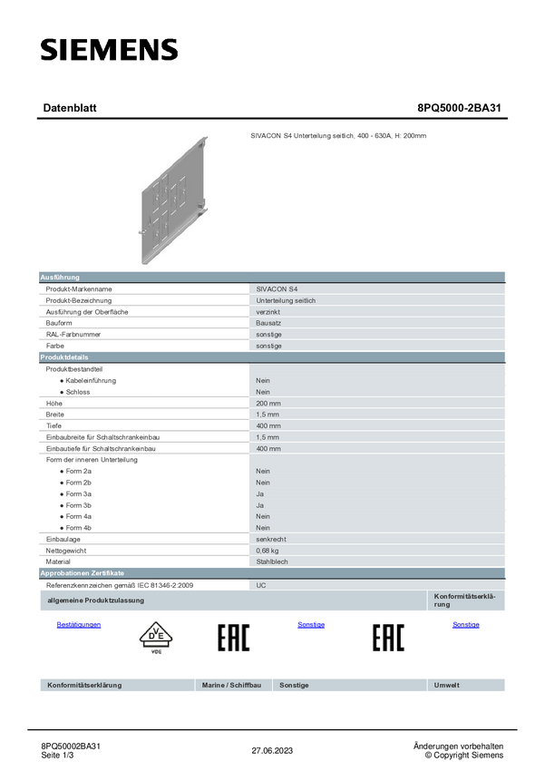 Pooddział Siemens 8PQ5000-2BA27 1 szt.