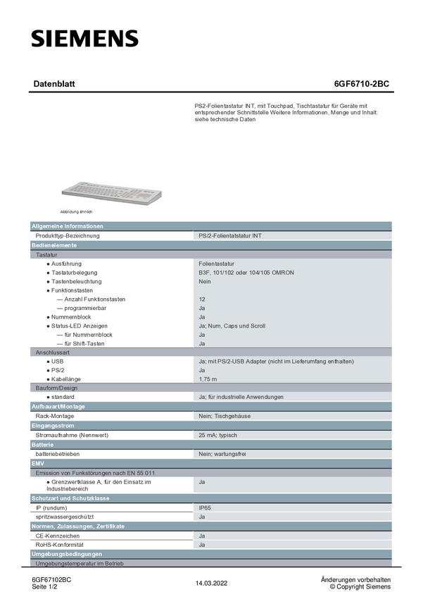 Klawiatura Siemens 6GF6710-2BC Niemiecki, QWERTZ