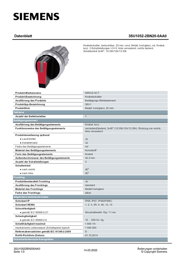 Siemens 3SU10522BN200AA0 3SU1052-2BN20-0AA0 Przełącznik blokada czerwony 2 x 45 ° 1 szt.