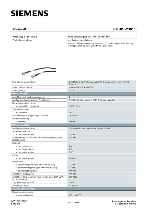 Kabel antenowy Wi-Fi Siemens 6GT2815-2BN15 6GT28152BN15