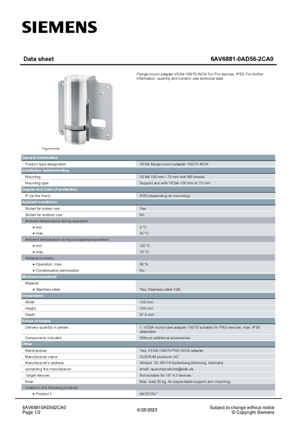 Adapter okrągły rurowy PLC Siemens 6AV6881-0AD56-2CA0 6AV68810AD562CA0