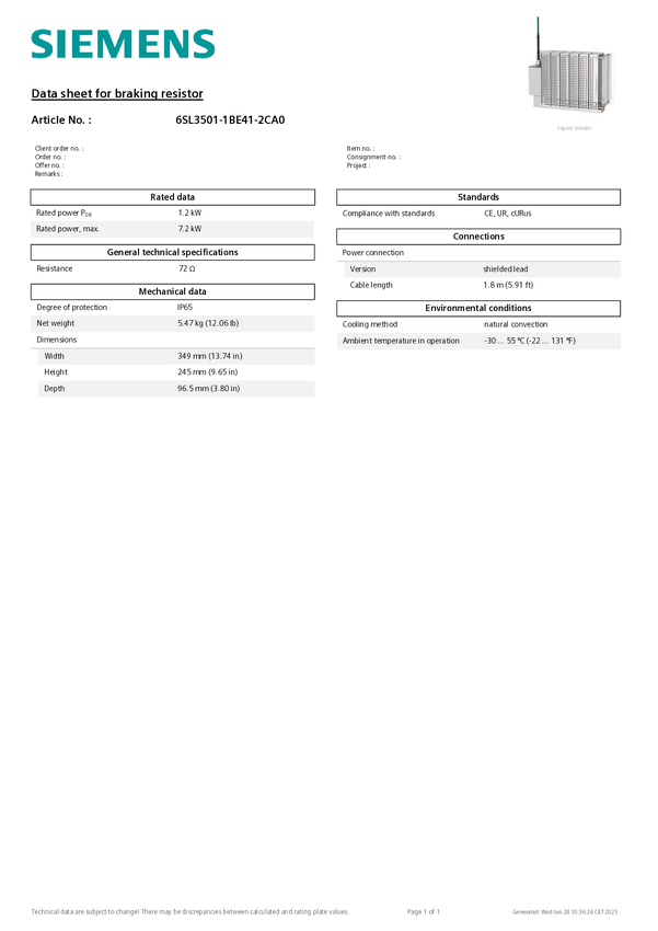 Rezystor hamujący Siemens 6SL3501-1BE41-2CA0