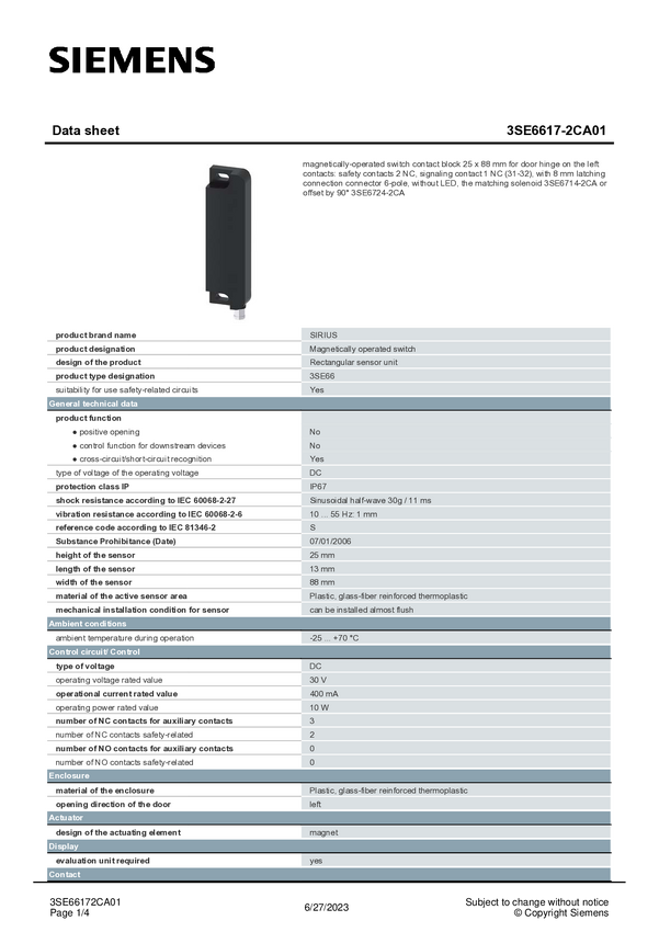 Przełącznik magnetyczny Siemens 3SE6617-2CA01, 1 szt.