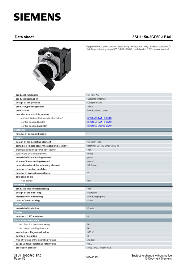 Siemens 3SU11502CF601NA0 3SU1150-2CF60-1NA0 Przełącznik 1 szt.