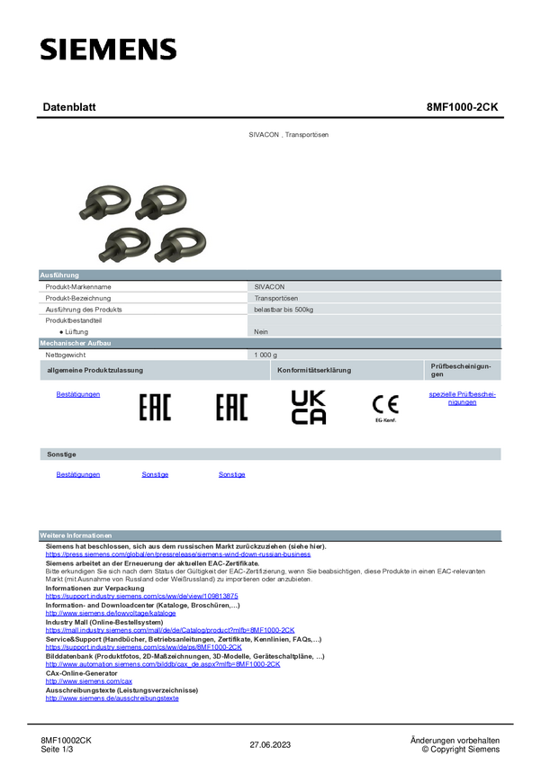 Uchwyt transportowy Siemens 8MF1000-2CK 4 szt.