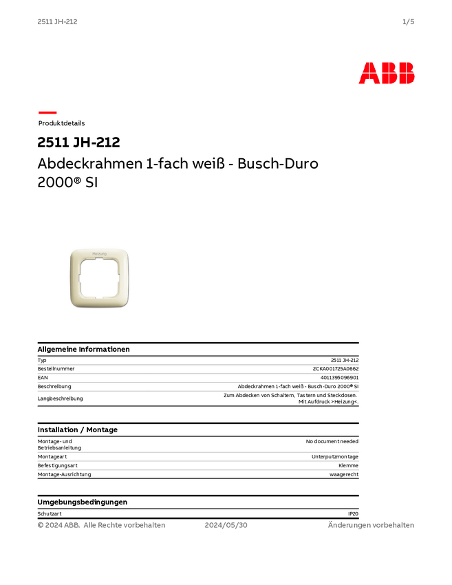 Busch-Jaeger 1 x Ramka Ramka, Wyłącznik bezpieczeństwa Duro 2000 SI kremowo-biały, biały 2CKA001725A0662 1 szt.