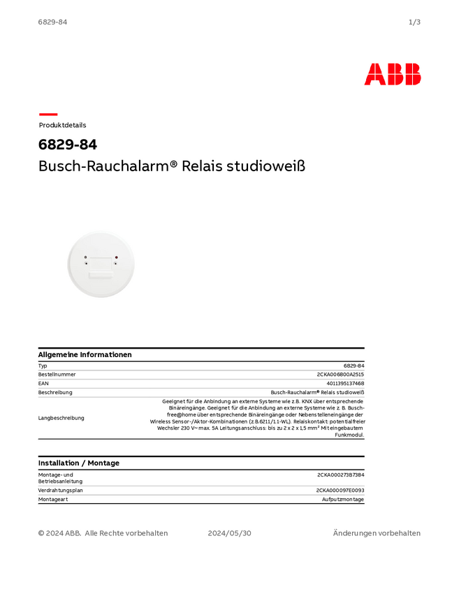 Busch-Jaeger 6829-84 Radiowy czujnik dymu i ciepła