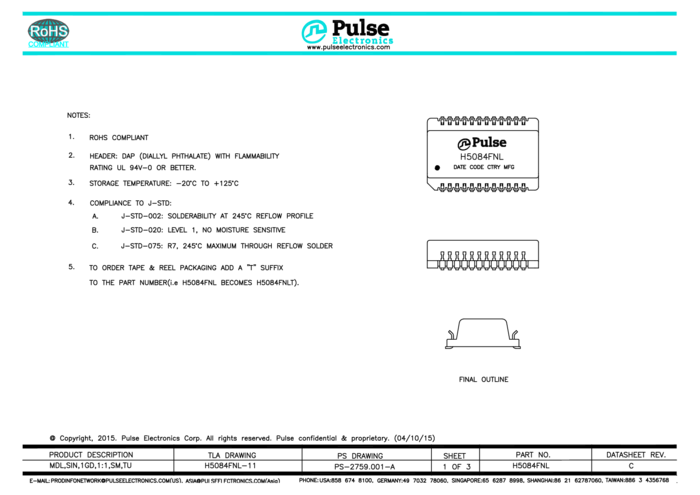Telecom Transformer 1:1/1:1 1500Vrms -1.2dB Surface Mount