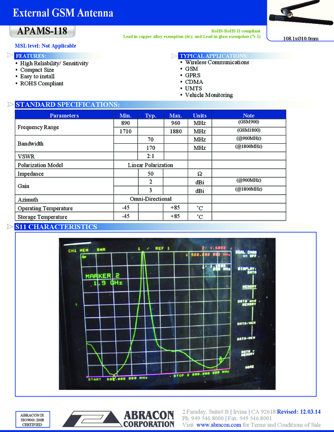 GSM EXTERNAL ANTENNA. GSM900:890-960MHZ (GAIN: 2DB); GSM1800