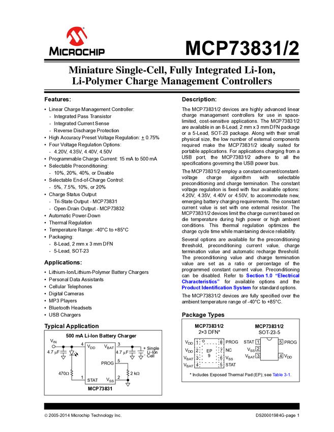 Microchip Technology MCP73831T-2DCI/OT PMIC - sterownik baterii Sterownik ładowania Li-Ion, LiPo SOT-23-5 montaż na powi