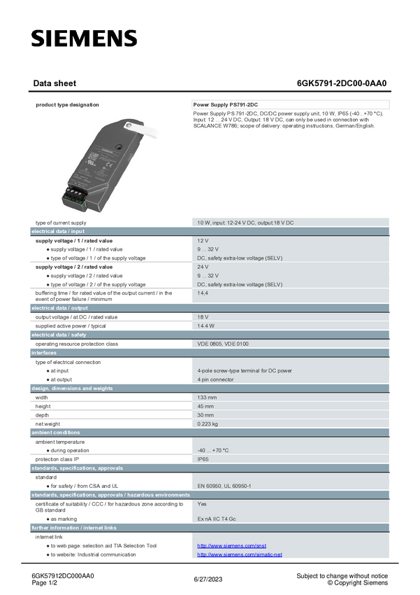 Zasilacz na szynę DIN Siemens 6GK5791-2DC00-0AA0 6GK57912DC000AA0