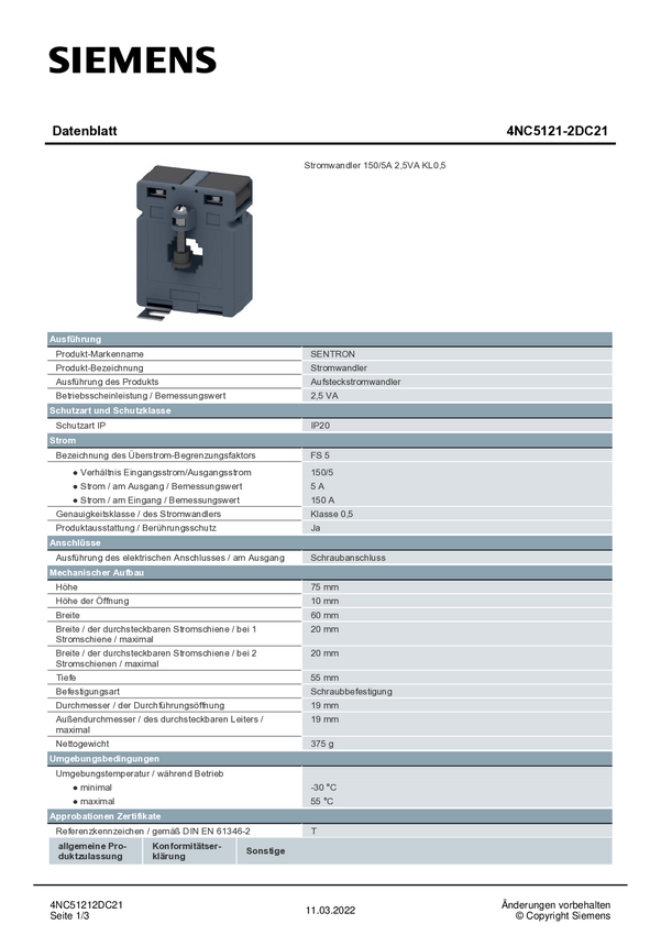 Siemens 4NC5121-2DC21 4NC51212DC21 Transformator 1-fazowy Prąd pierwotny 150 A Prąd wtórny 5 A Średnica otworu:19 mm Mon