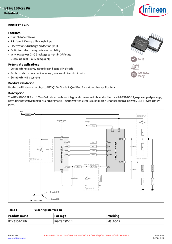 RDS(on) @ Tj = 25°C: 100 mΩ | 2 channels | Vs (extended) = 60V | PRO-SIL™ ISO 26262-ready The BTH6100-2EPA, as part of the PROFET™ + 48V family, features 2 channels with proportional analog current sense. This 100 mΩ dual-channel device is suitable for a 48 V board net. It comes in a small TSDSO-14 exposed pad package and is footprint compatible with family members, offering protection and diagnostic functions.