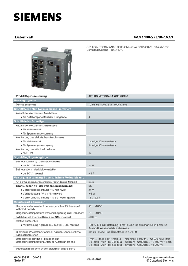 Switch przemysłowy Ethernet Siemens 6AG1308-2FL10-4AA3 6AG13082FL104AA3