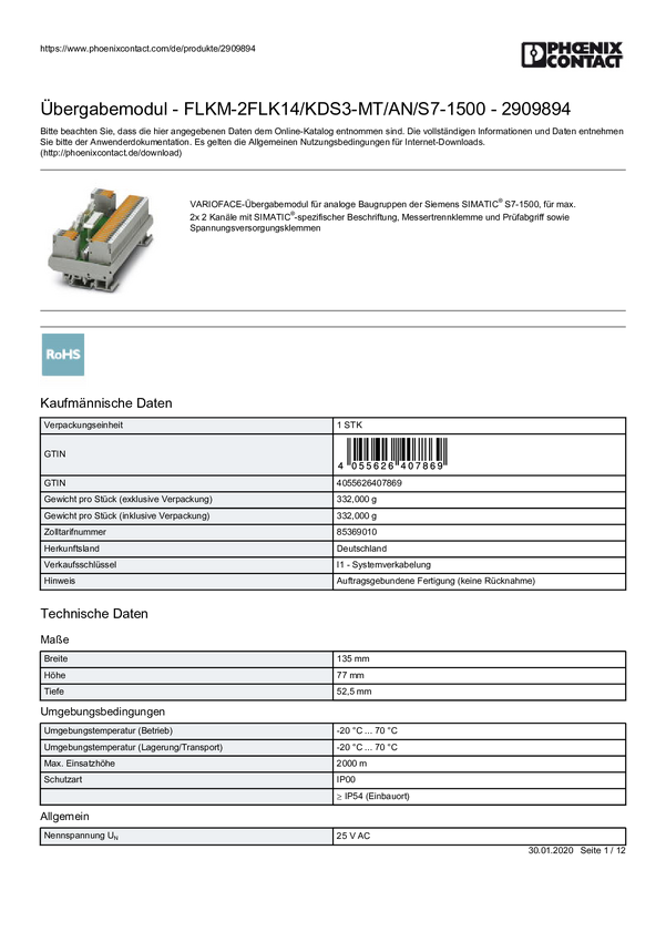 Moduł pasywny Phoenix Contact 2908464 VIP-3/SC/2FLK14/AN/2P/S7-1500A Zawartość: 1 szt.
