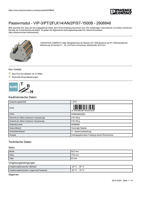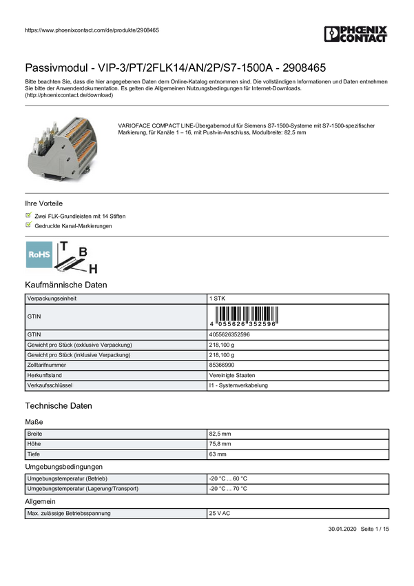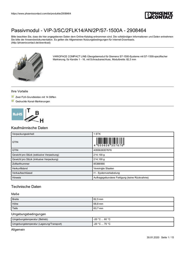 Moduł pasywny Phoenix Contact 2908465 VIP-3/PT/2FLK14/AN/2P/S7-1500A Zawartość: 1 szt.