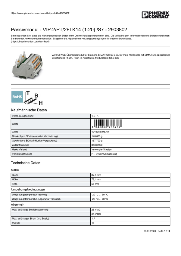 Moduł pasywny Phoenix Contact 2903802 VIP-2/PT/2FLK14 (1-20) /S7 Zawartość: 1 szt.