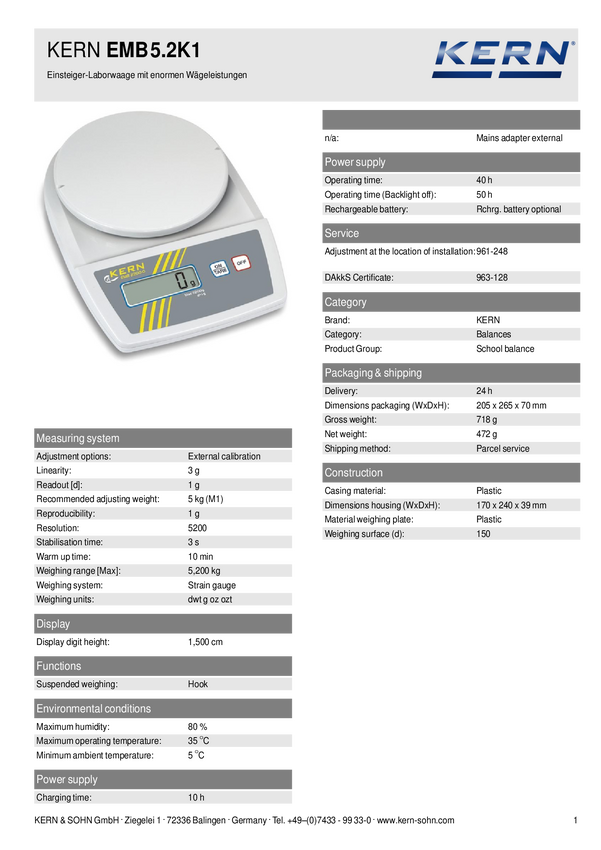 Kern EMB 5.2K1 Waga szkolna Kalibracja (ISO) Zakres pomiaru maks. 5.2 kg Podziałka 1 g bateryjne biały